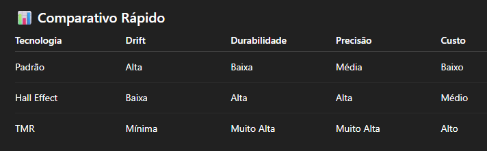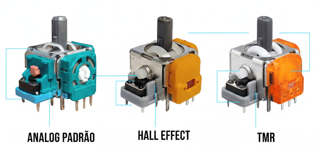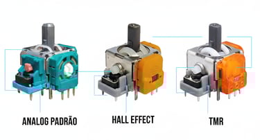 Entenda as diferenças entre analógico Padrão, Hall Effect e TMR, conheça vantagens, desvantagens, durabilidade e saiba qual tecnologia é melhor para controles de videogame.